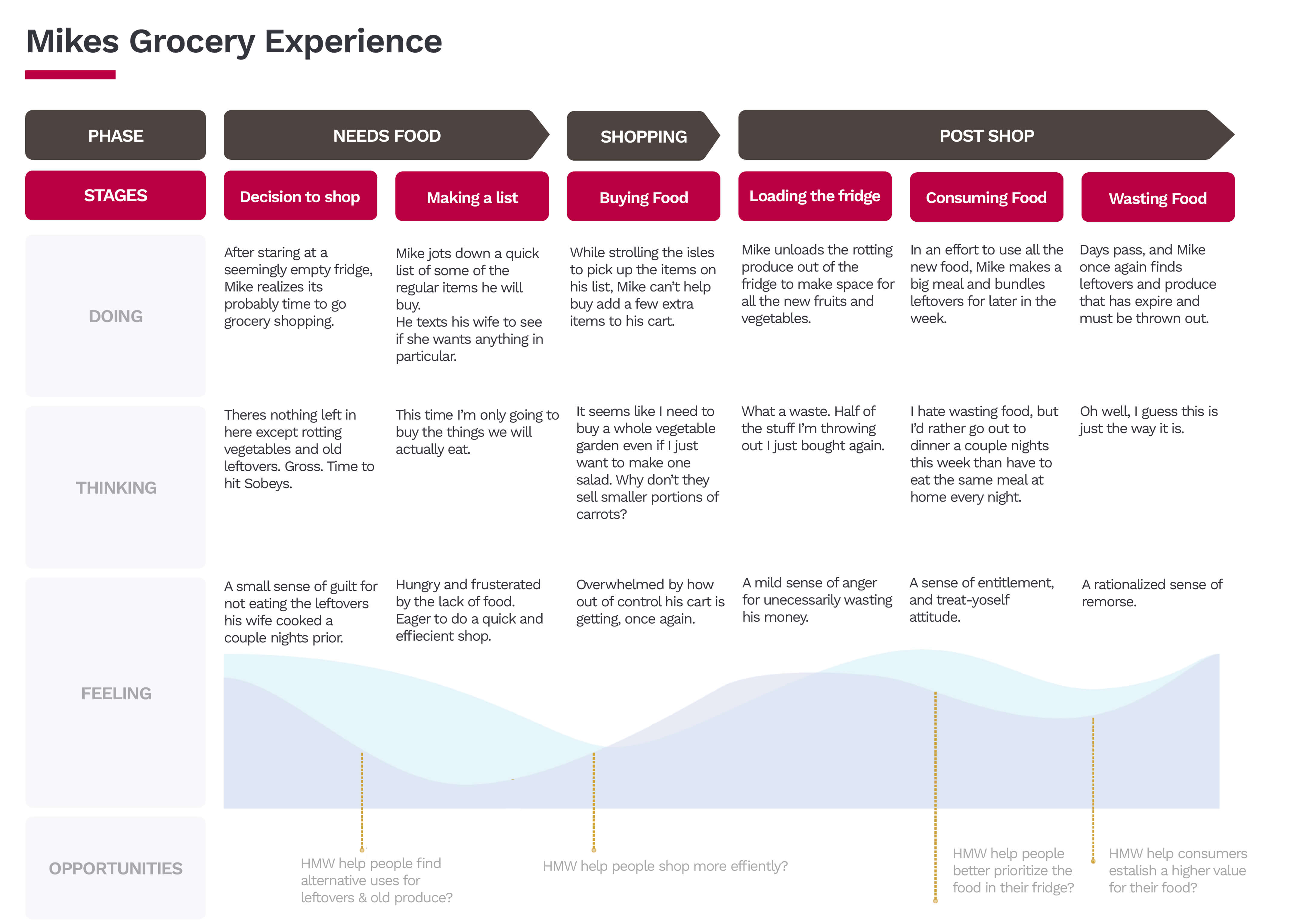 Mike's experience map allowed us to visually identify his pain points, and convert them into a list of opportunities where we could introduce technology to help alleviate their impact on foodwaste.